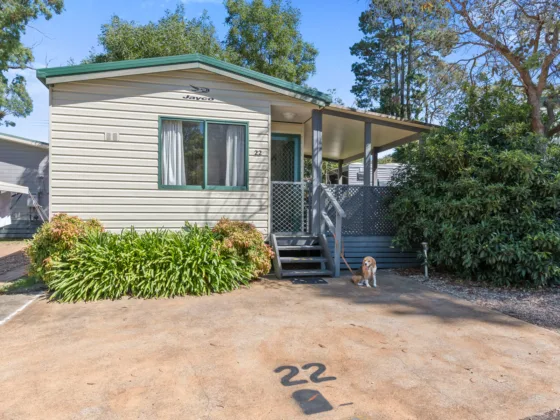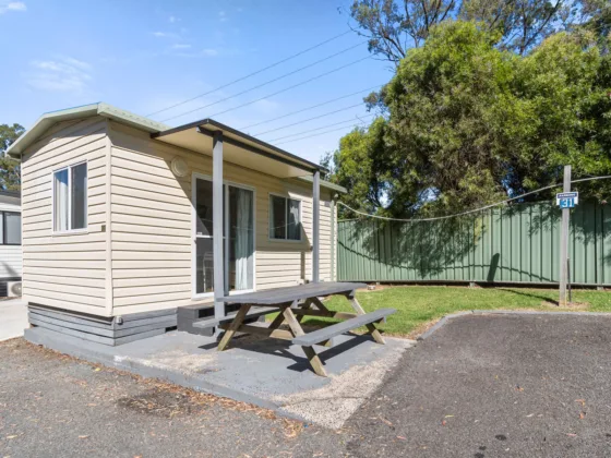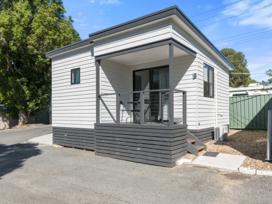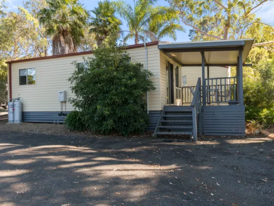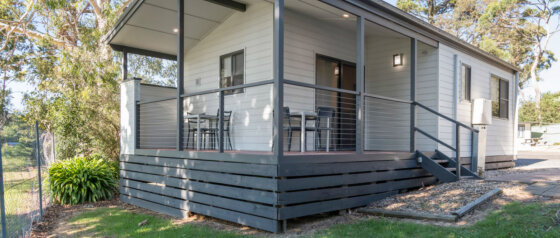 This pet-friendly two-bedroom cabin sleeps up to four guests with a double bed and a set of single bunk beds. It features a spacious open-plan living, dining, and kitchen area with a full-size fridge, gas cooktop, microwave, and electric oven. Relax on the private balcony and enjoy the peaceful surrounds, with reverse cycle air conditioning for added comfort.