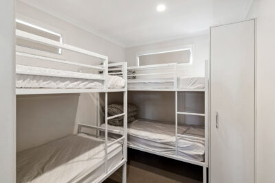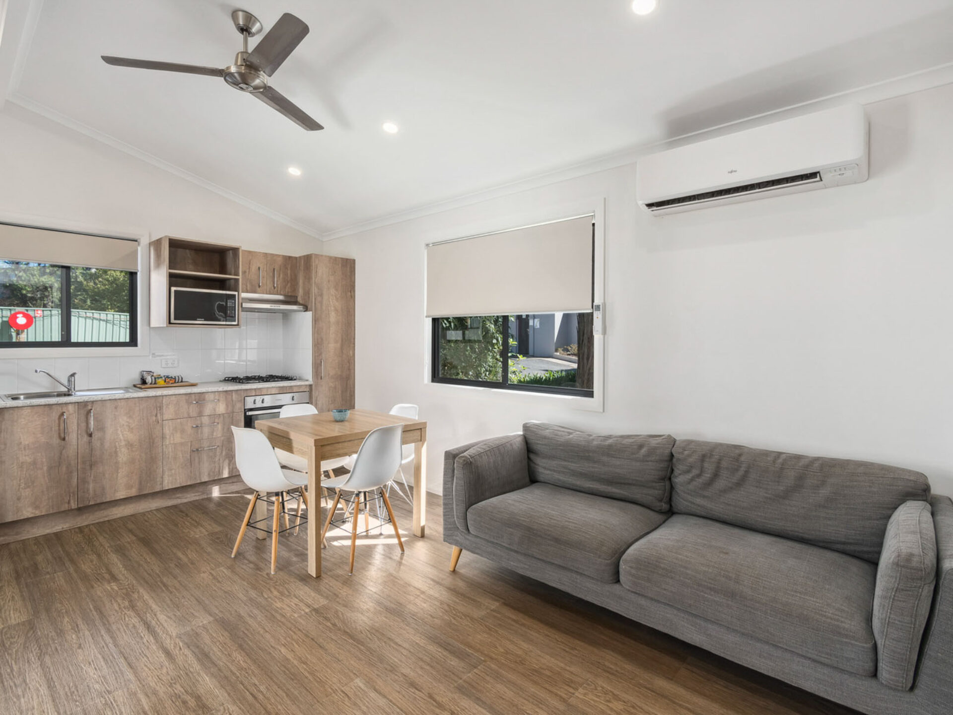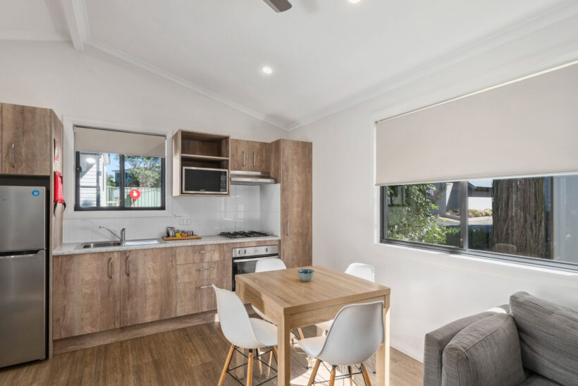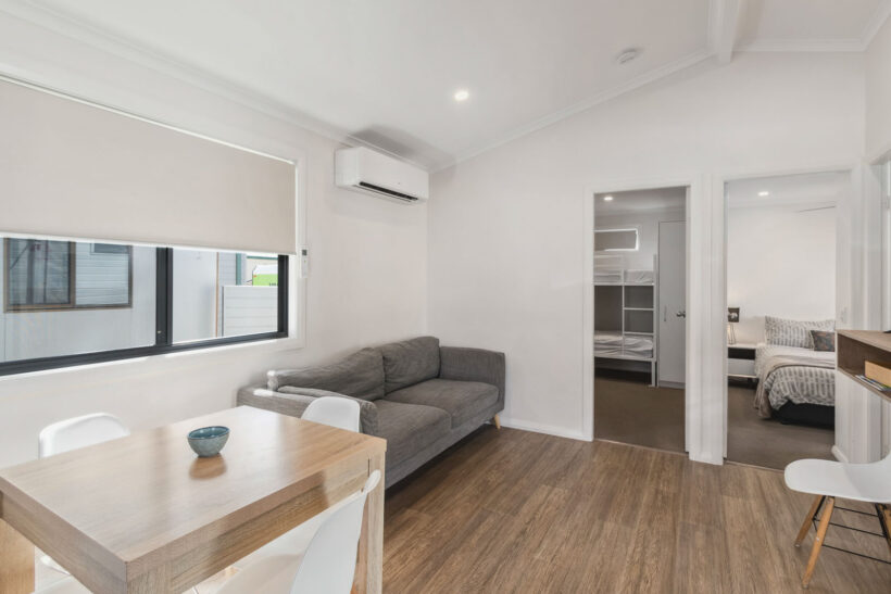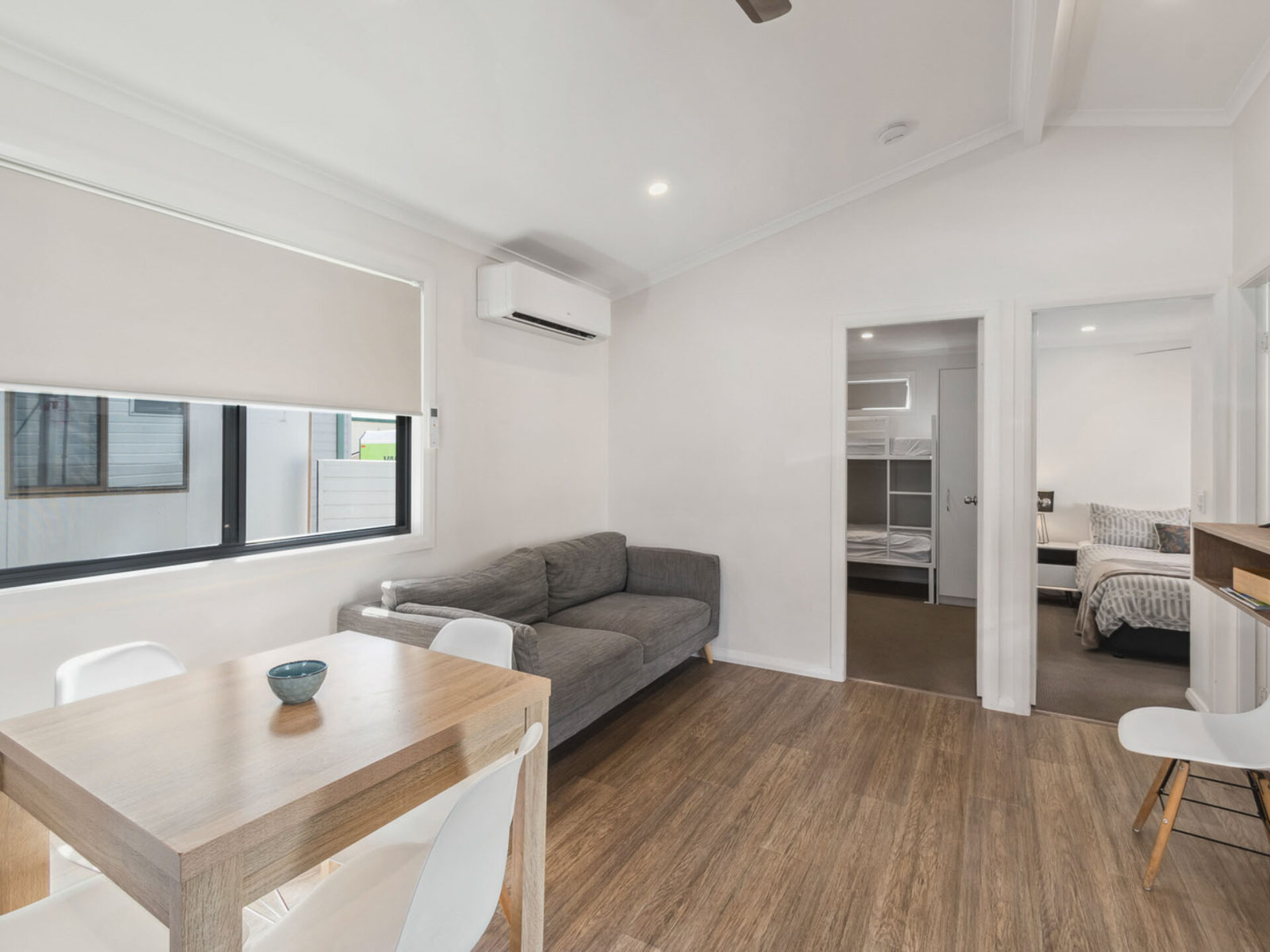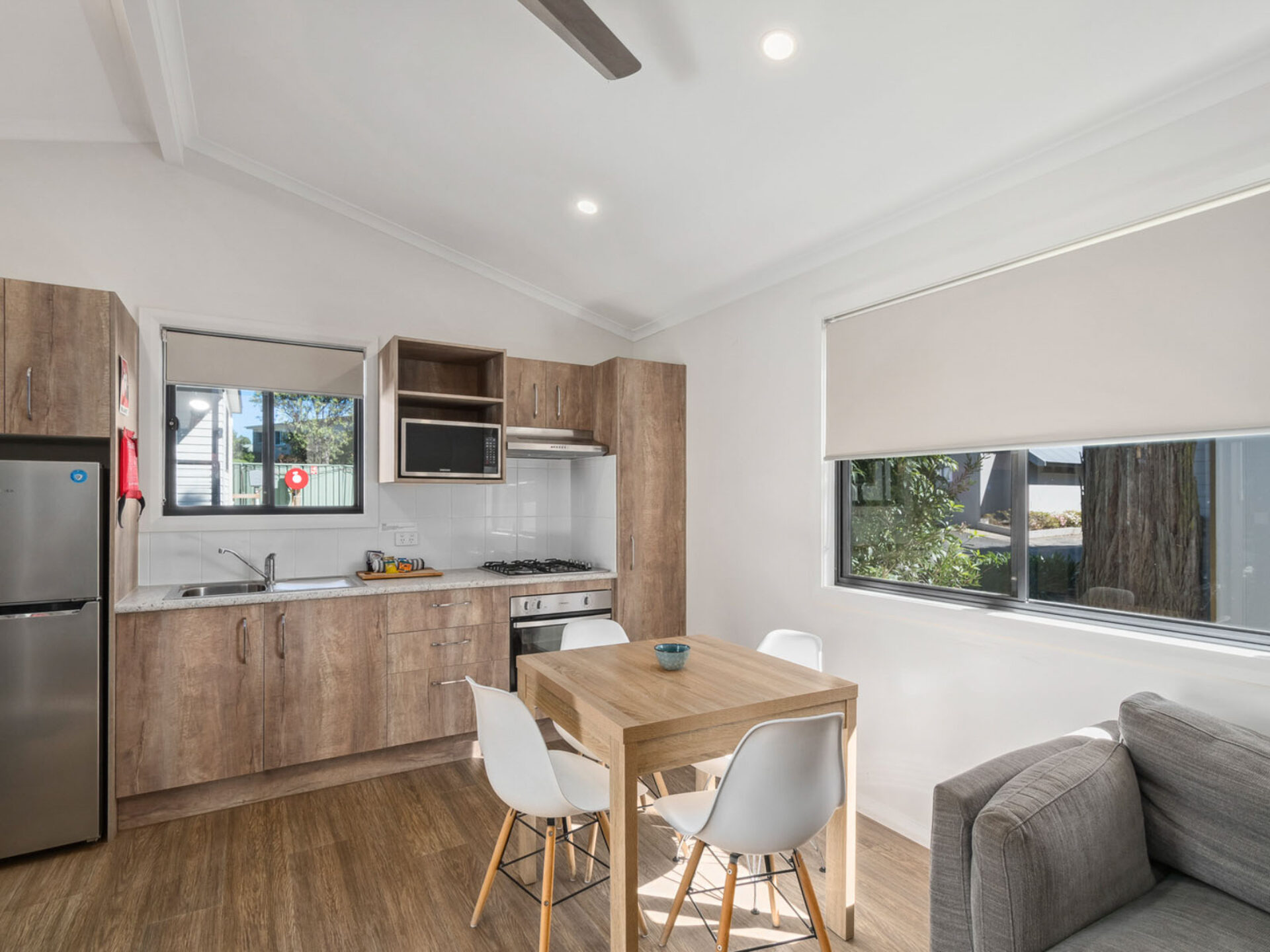 Sleeping up to six, this two-bedroom cabin features a queen bed and two sets of single bunk beds. The open-plan living area includes a full kitchen with electric oven, gas cooktop, microwave, and full-size fridge. Reverse cycle air conditioning provides comfort, and guests can enjoy access to all park facilities.