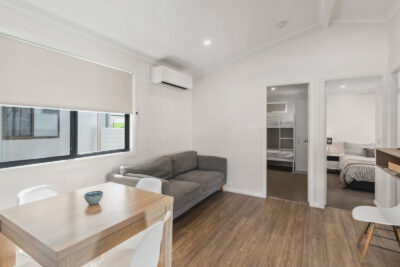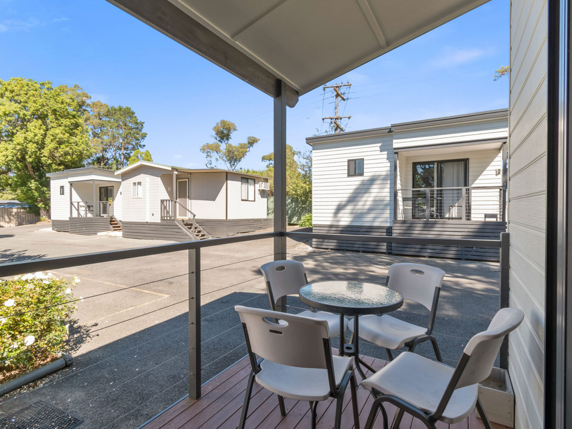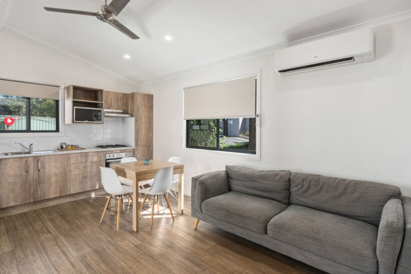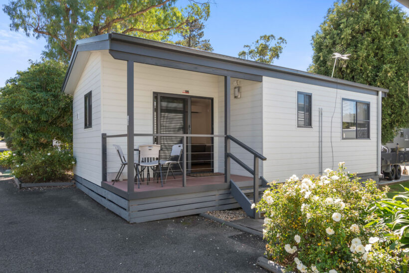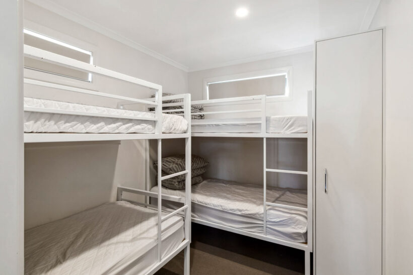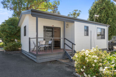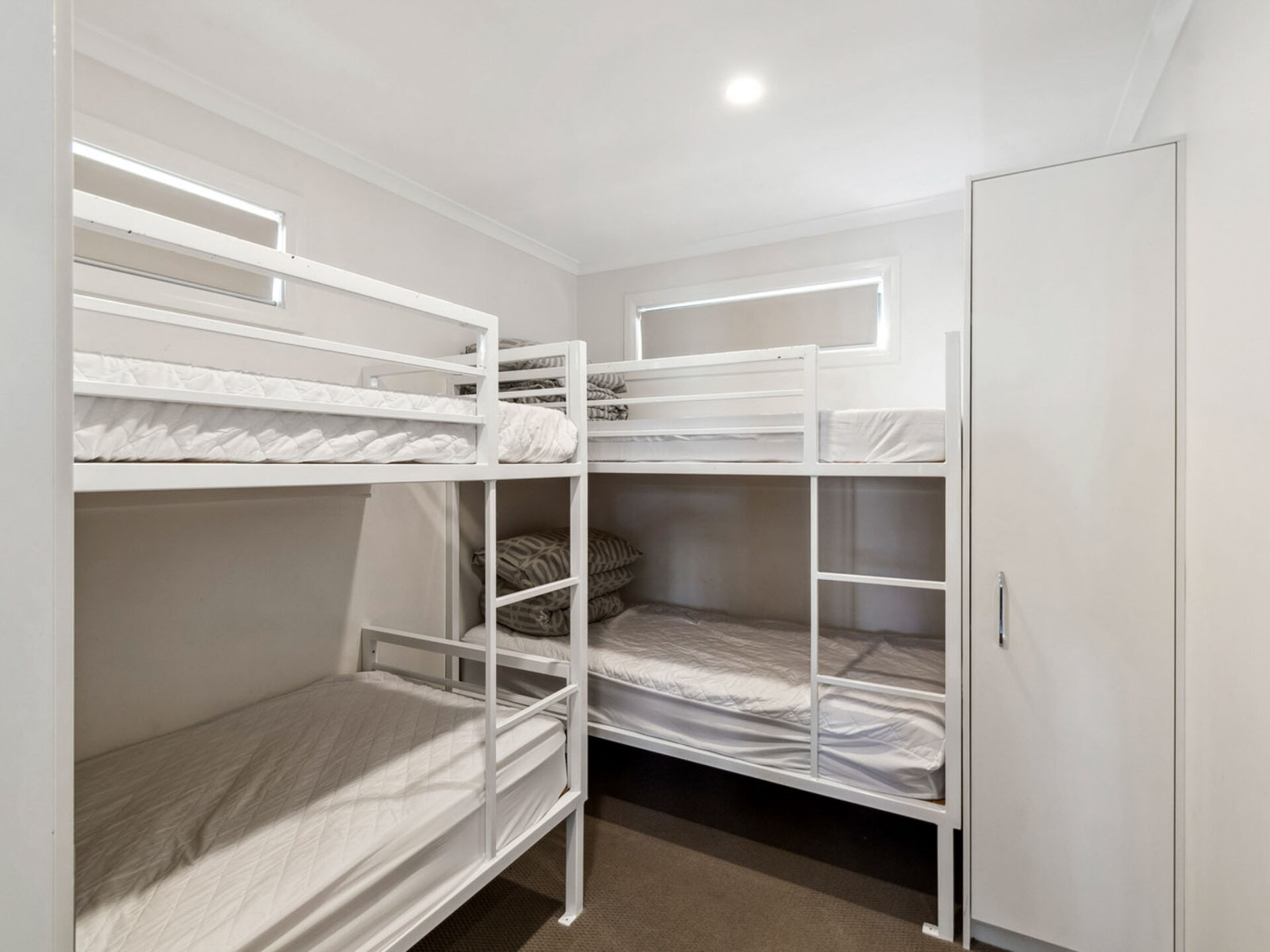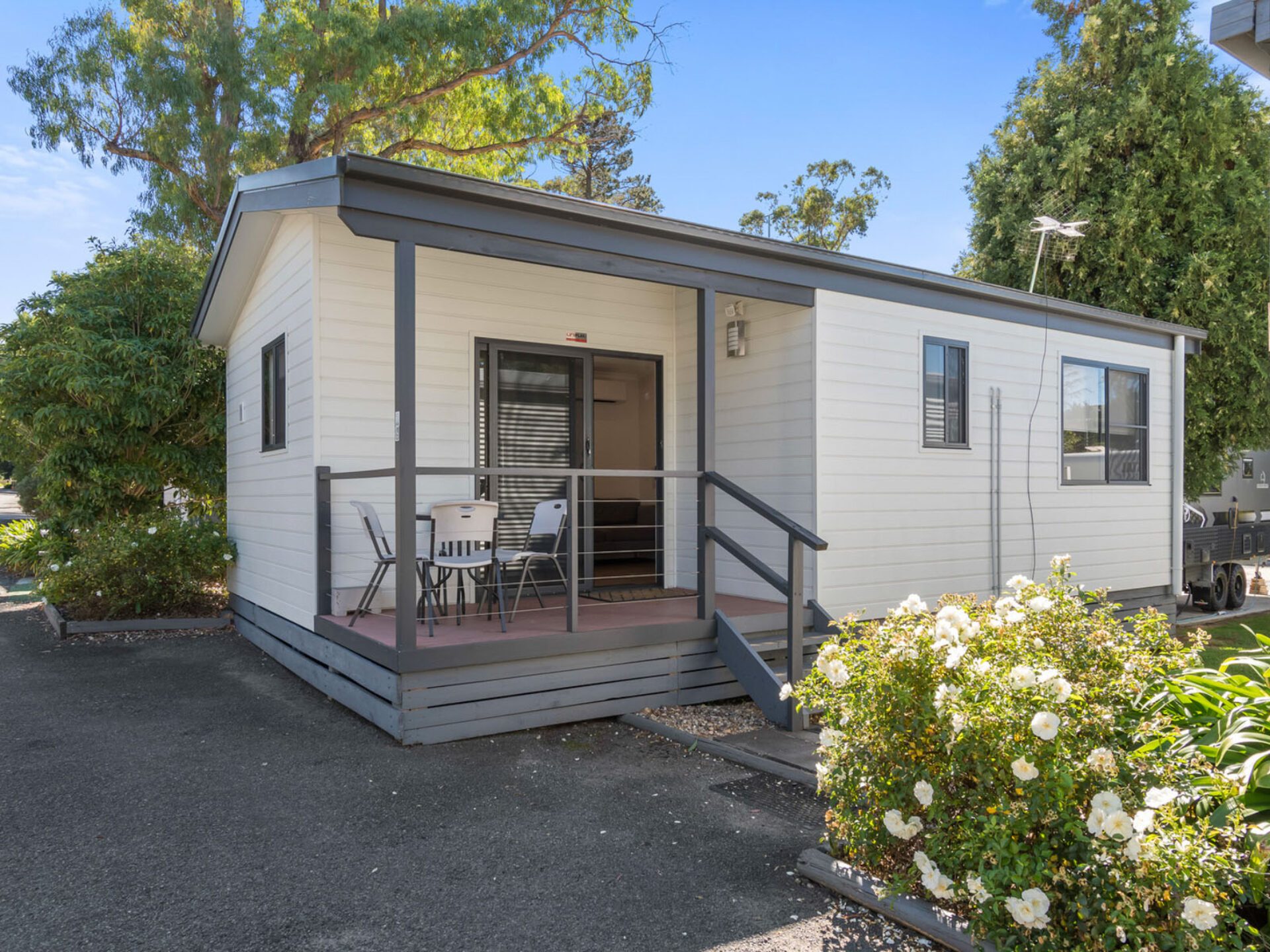 Sleeping up to six, this two-bedroom cabin features a queen bed and two sets of single bunk beds. The open-plan living area includes a full kitchen with electric oven, gas cooktop, microwave, and full-size fridge. Reverse cycle air conditioning provides comfort, and guests can enjoy access to all park facilities.