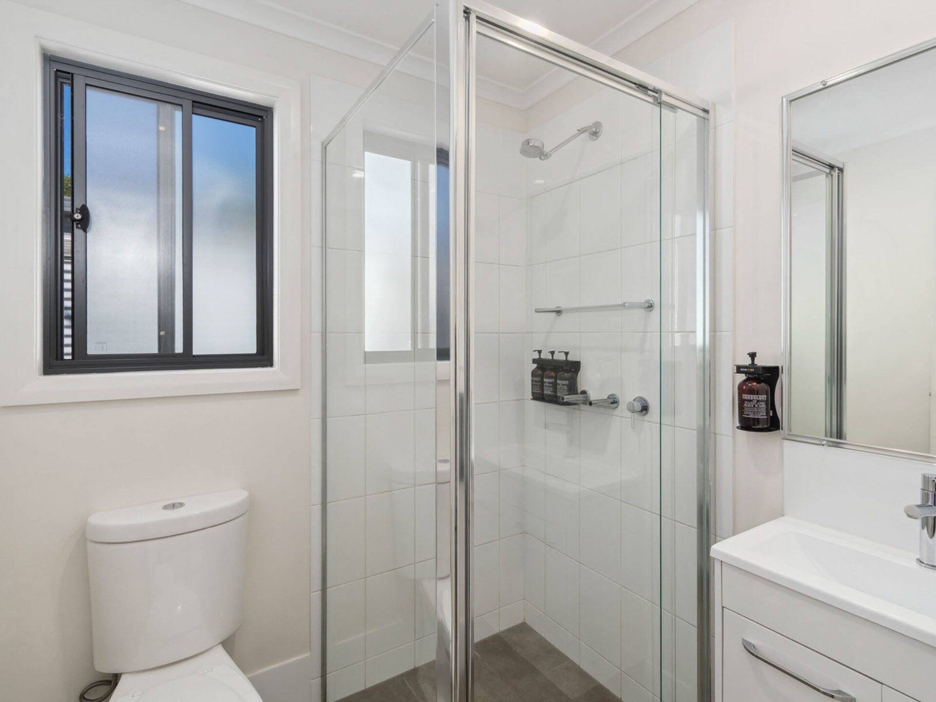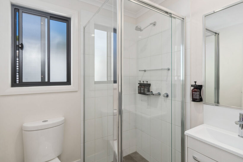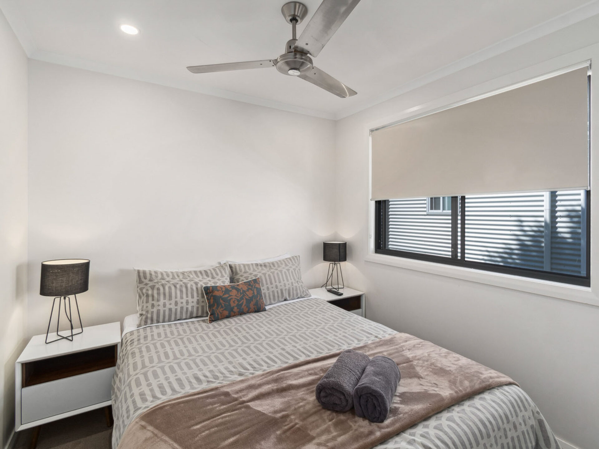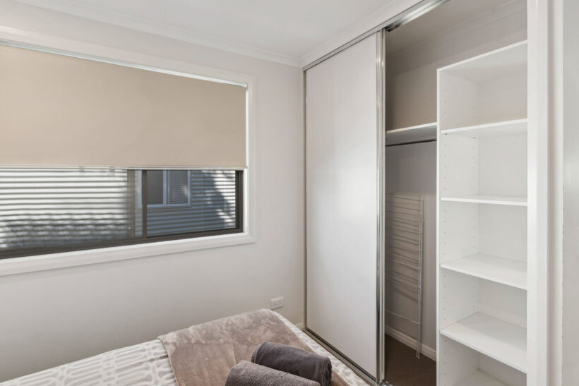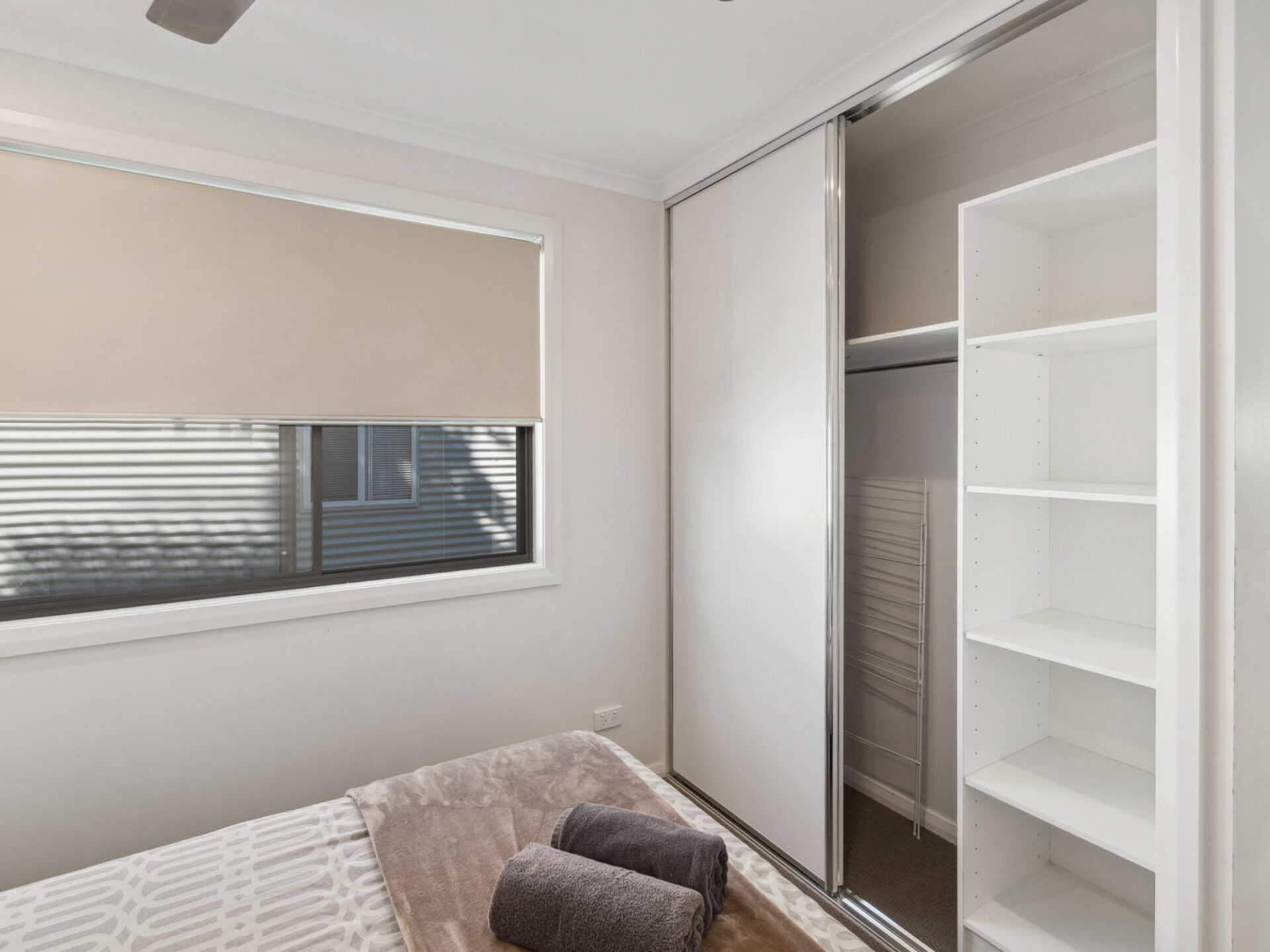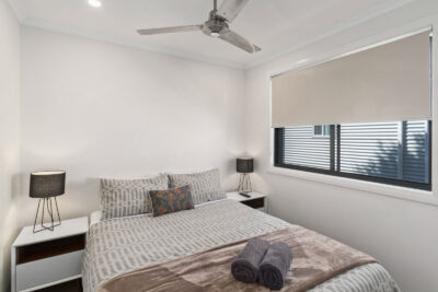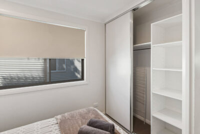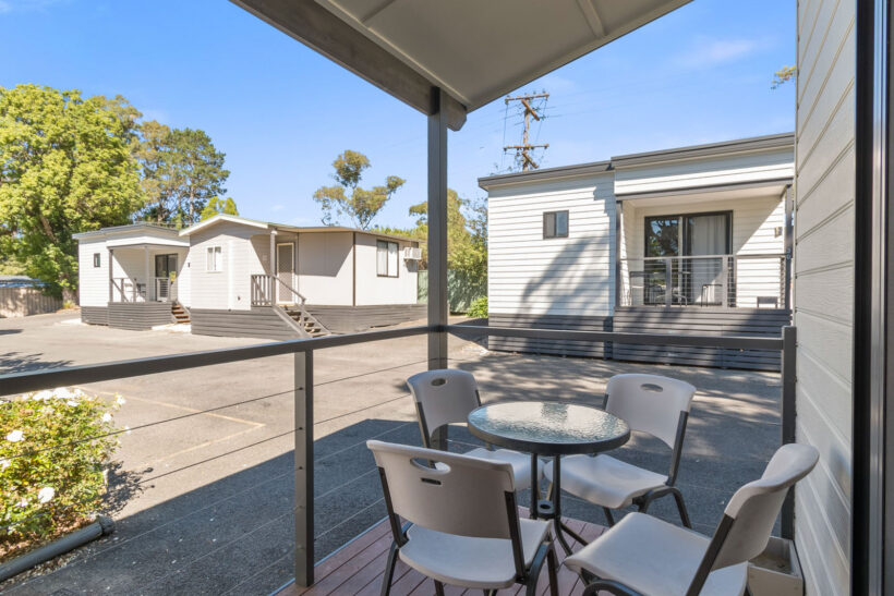 Sleeping up to six, this two-bedroom cabin features a queen bed and two sets of single bunk beds. The open-plan living area includes a full kitchen with electric oven, gas cooktop, microwave, and full-size fridge. Reverse cycle air conditioning provides comfort, and guests can enjoy access to all park facilities.