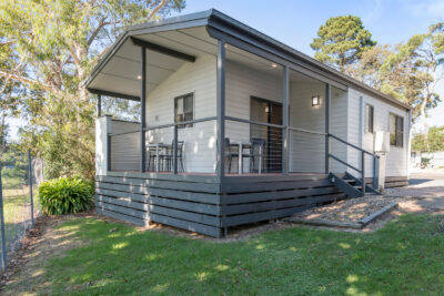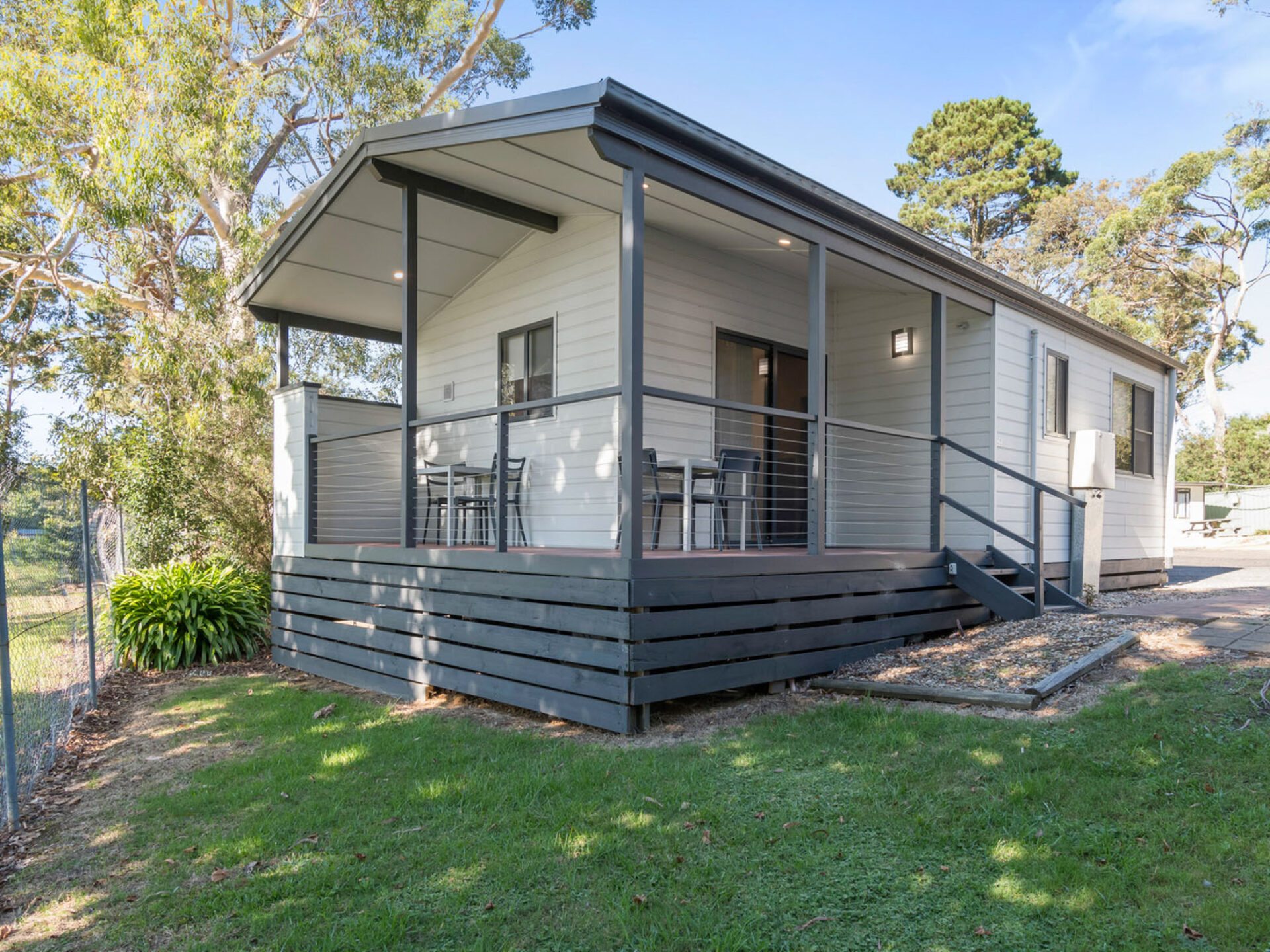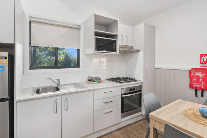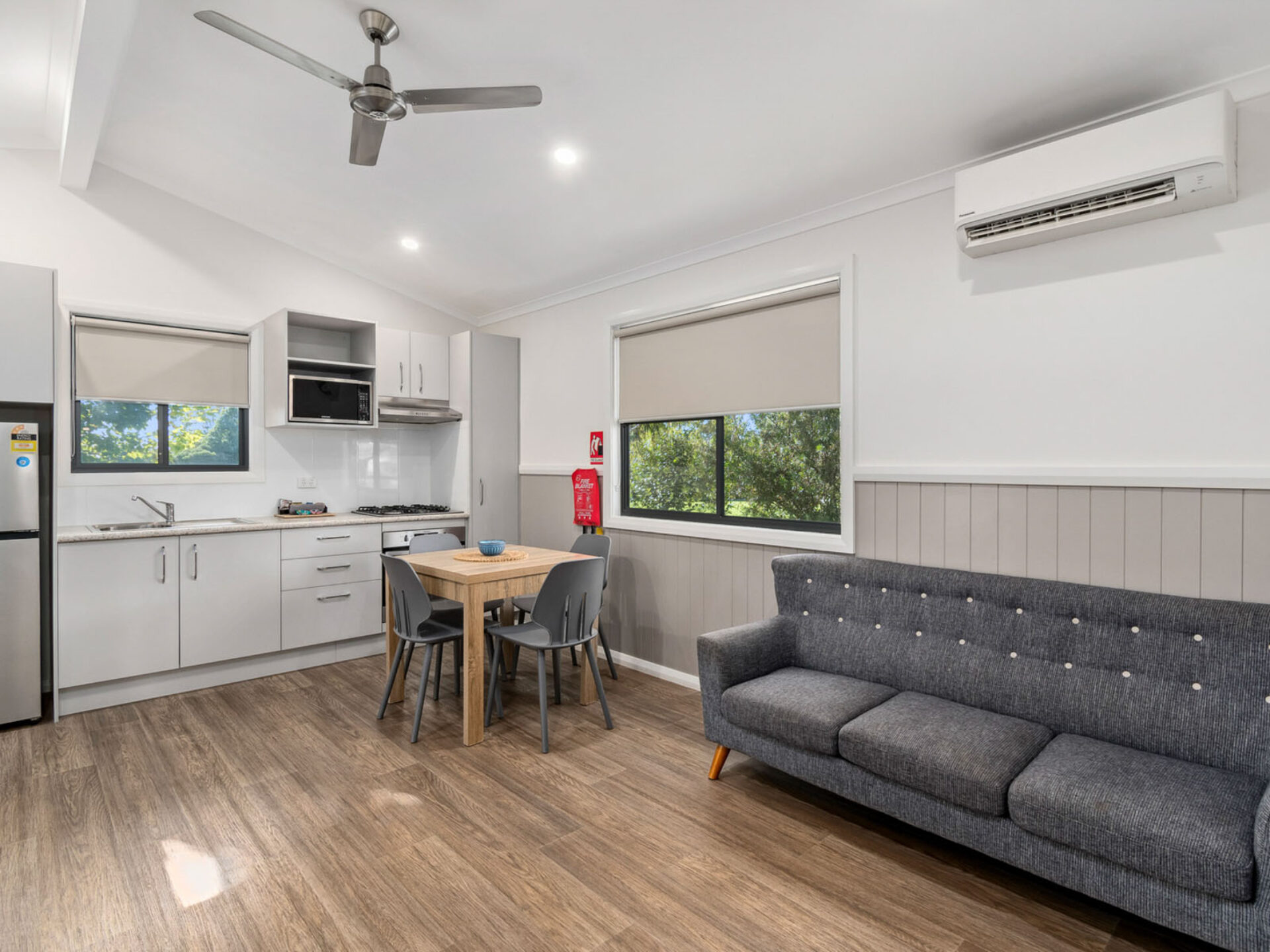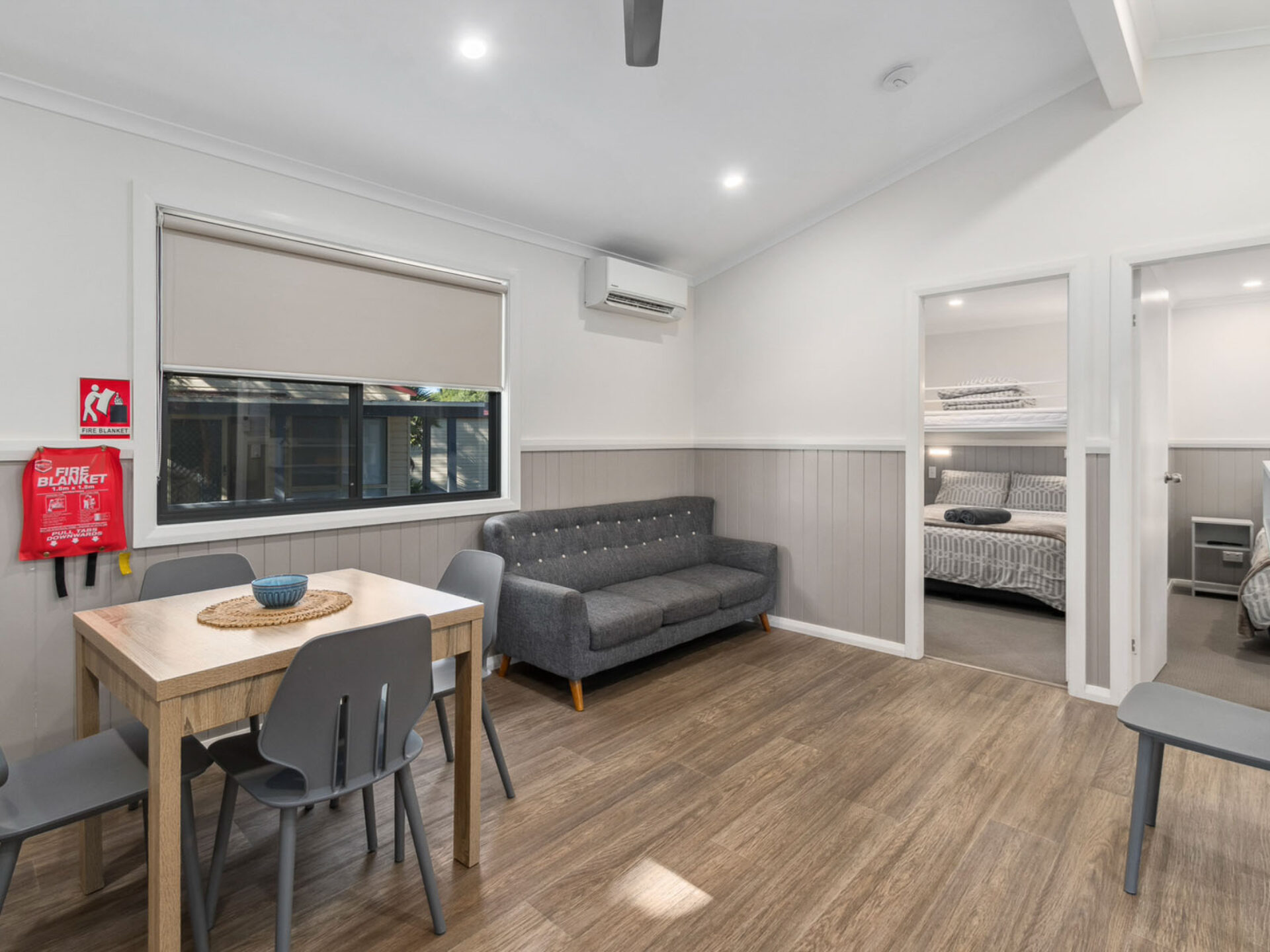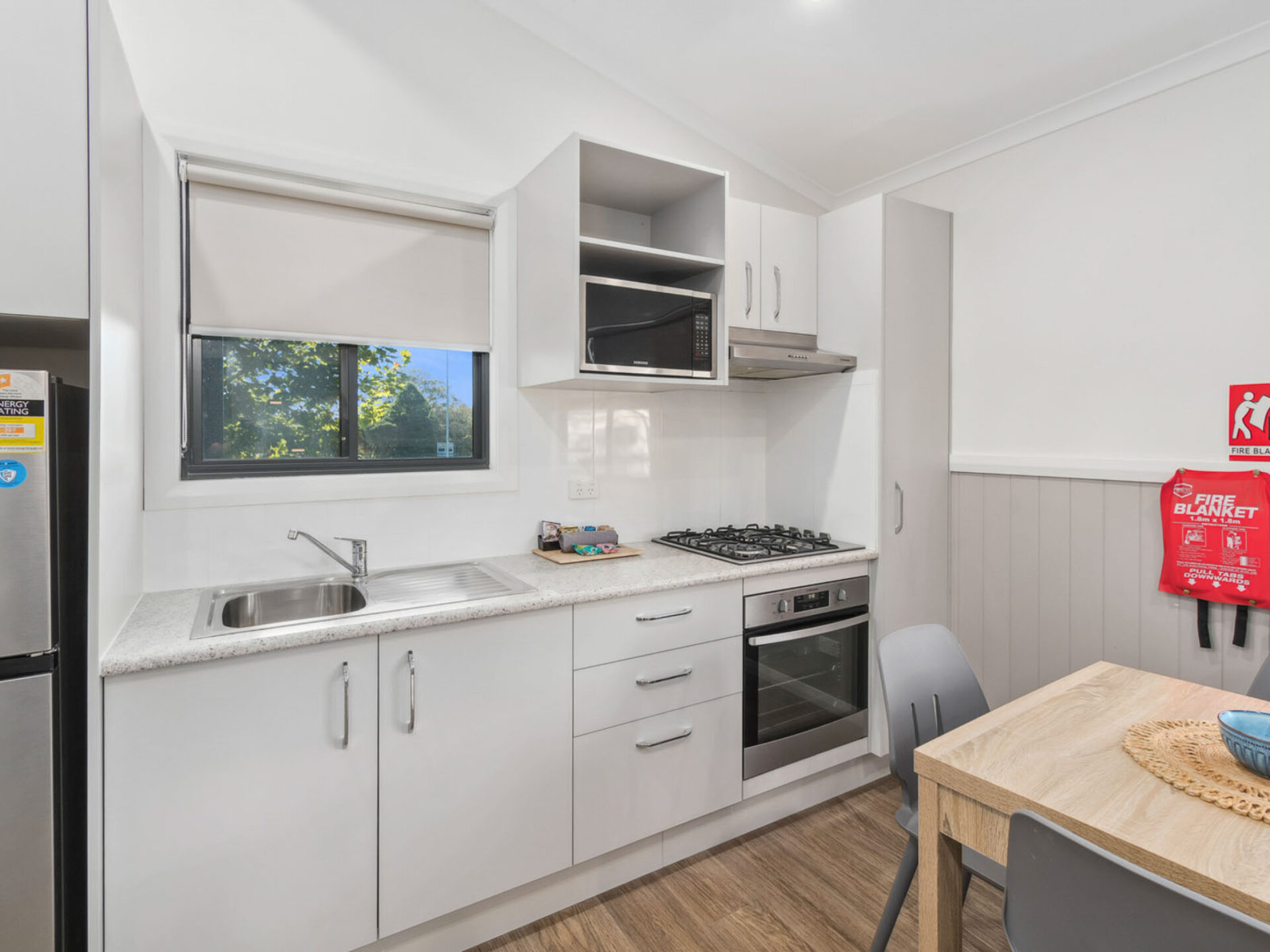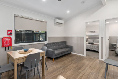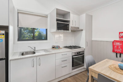 This spacious two-bedroom cabin sleeps up to five guests with a queen bed, double bed, and single bed. Featuring a full kitchen with electric oven, gas cooktop, microwave, and full-size fridge, it’s ideal for extended stays. Relax in the open-plan living and dining area or soak up the sun on the private balcony. Reverse cycle air conditioning ensures comfort.