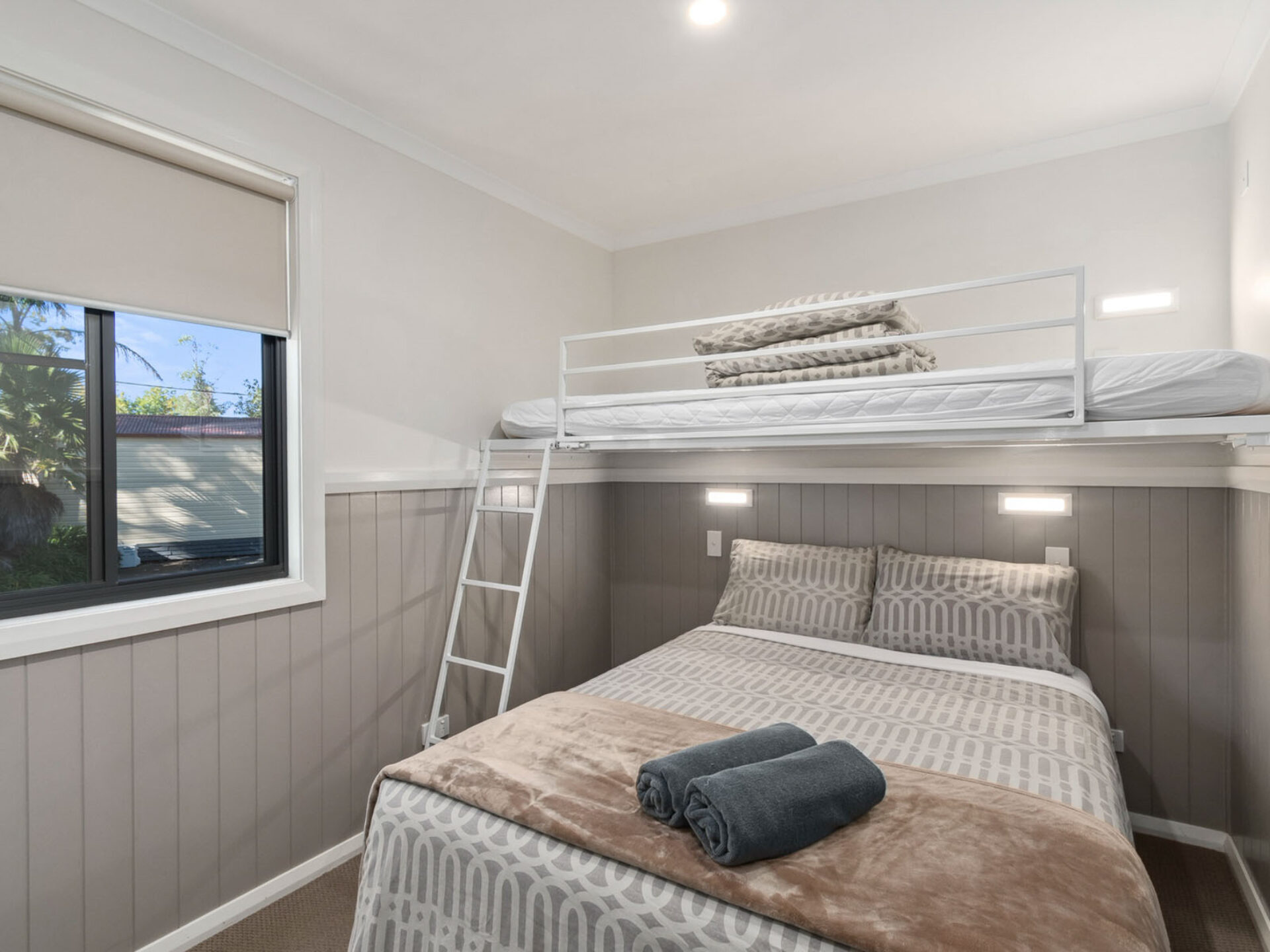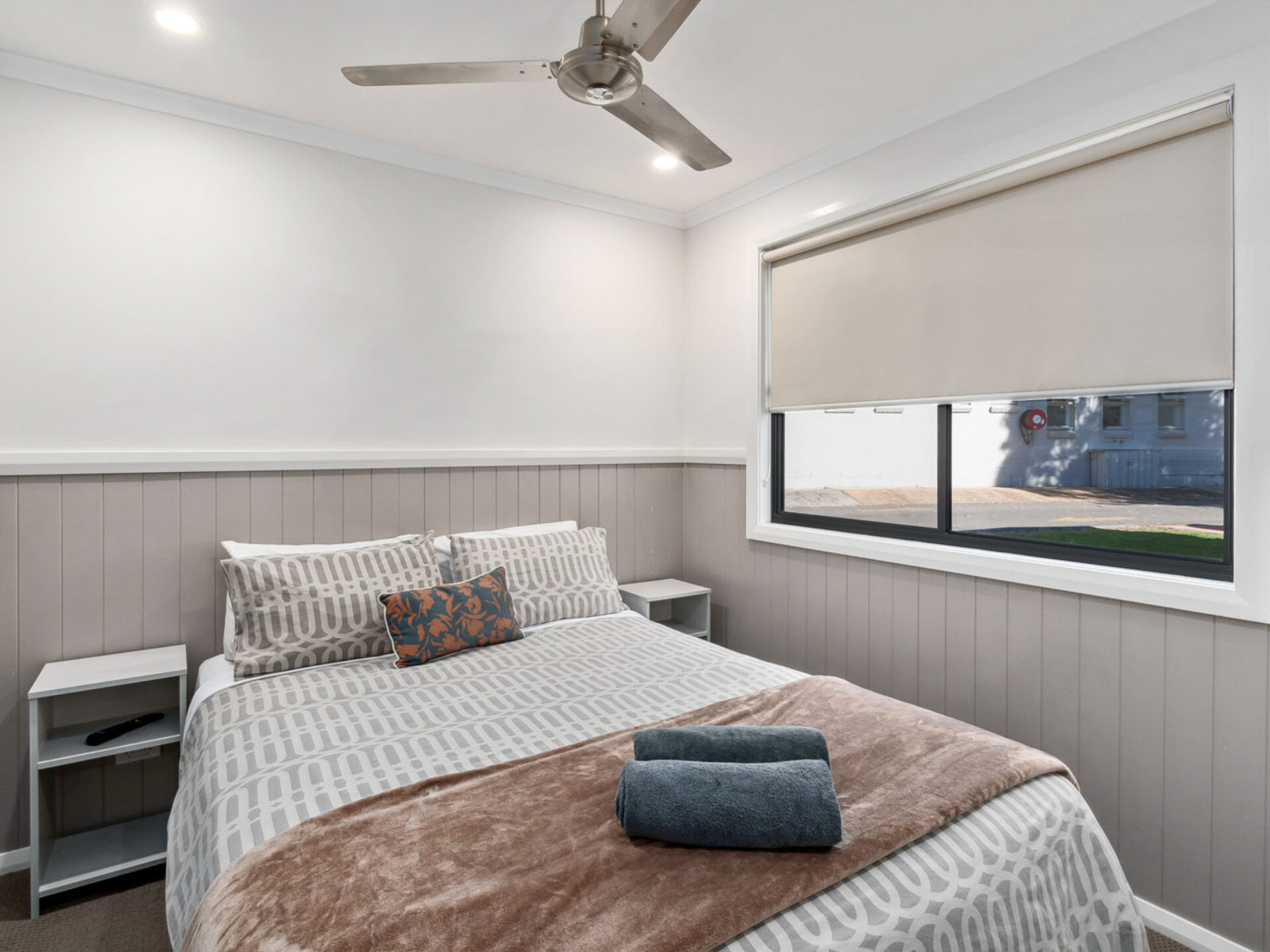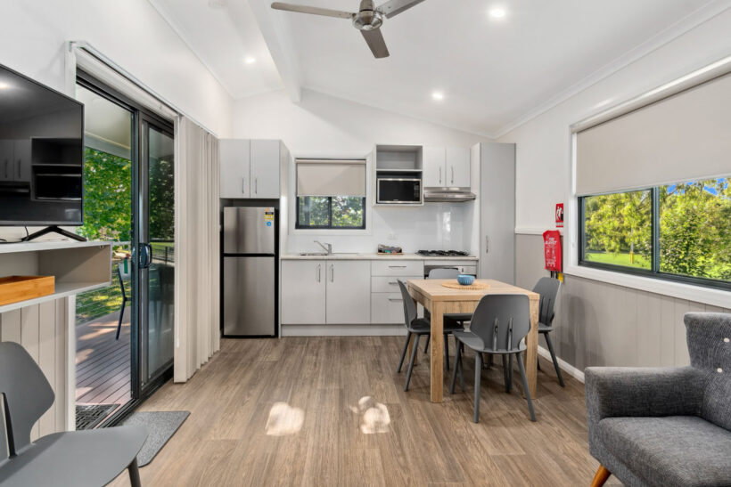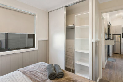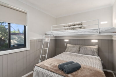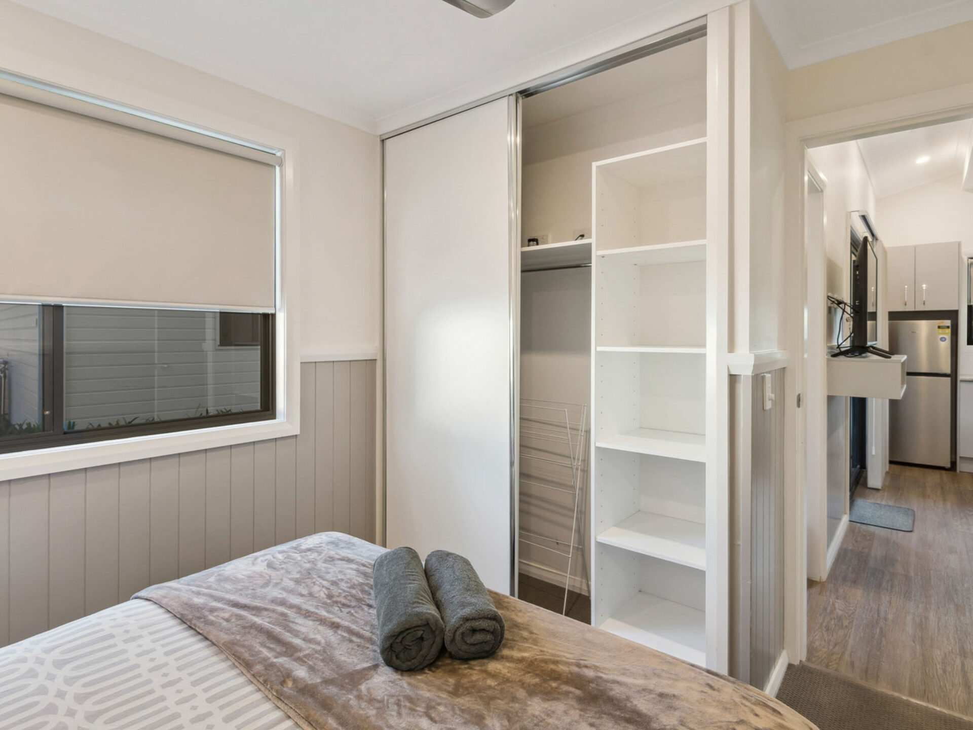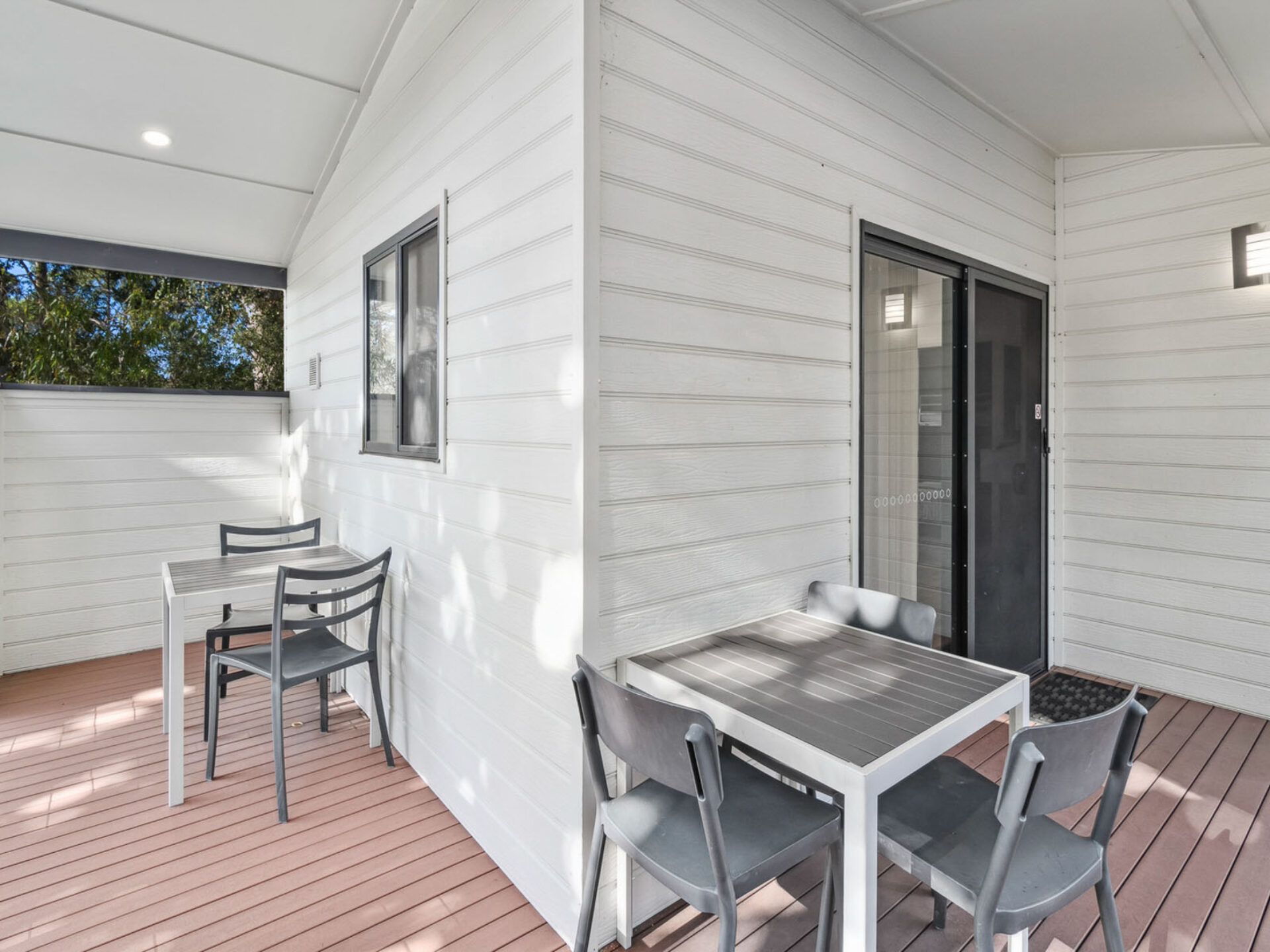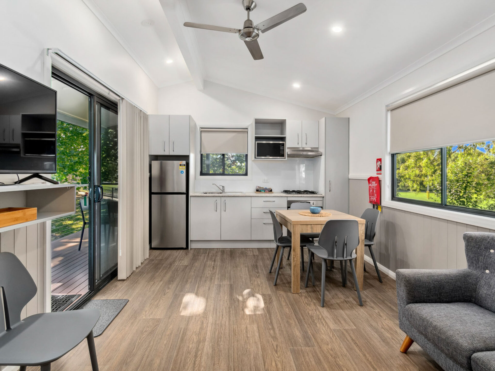 This spacious two-bedroom cabin sleeps up to five guests with a queen bed, double bed, and single bed. Featuring a full kitchen with electric oven, gas cooktop, microwave, and full-size fridge, it’s ideal for extended stays. Relax in the open-plan living and dining area or soak up the sun on the private balcony. Reverse cycle air conditioning ensures comfort.
