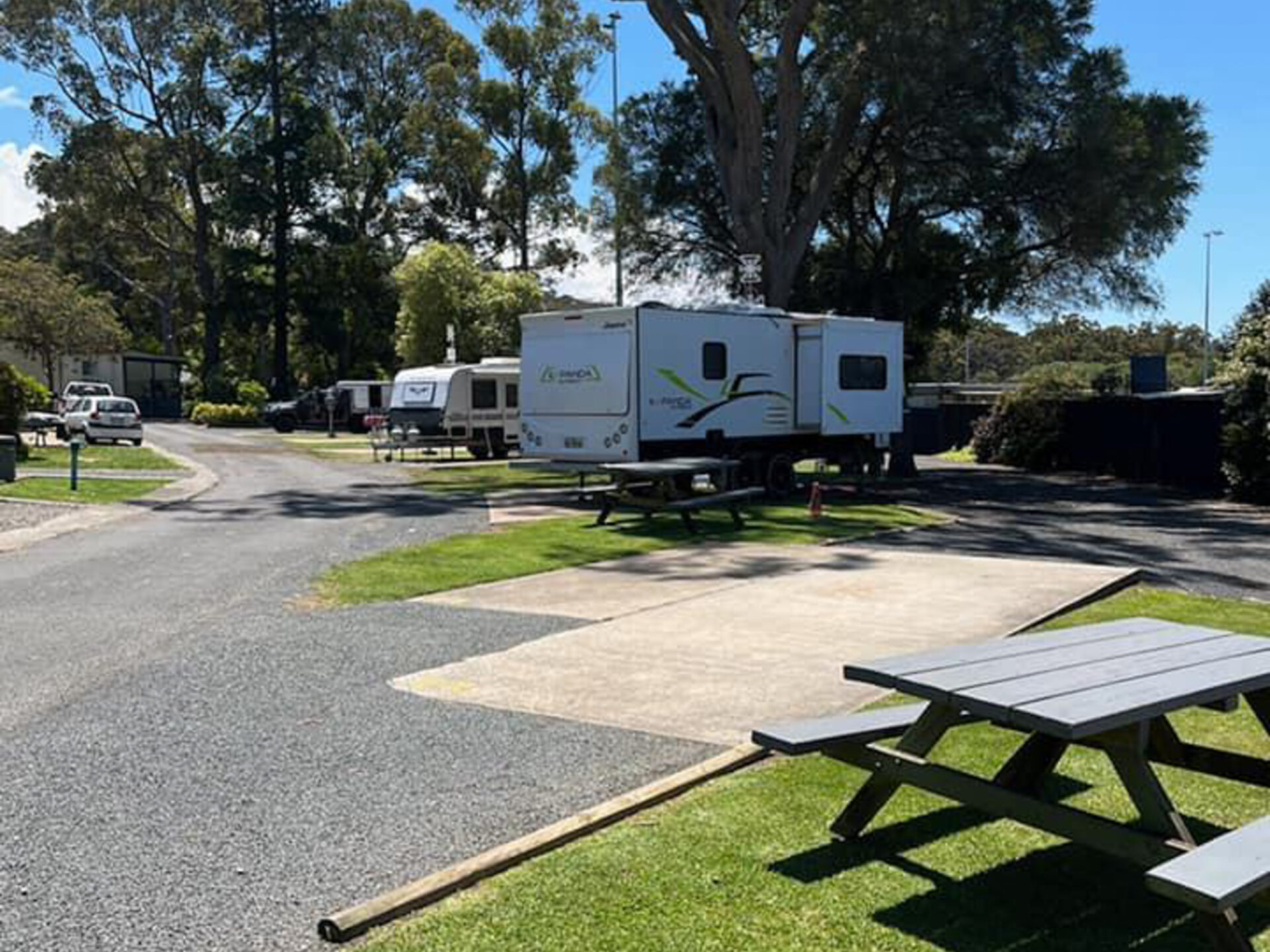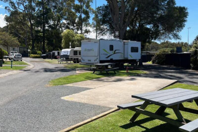These drive-through slab powered sites are ideal for caravans and motorhomes, offering a level concrete surface for easy setup. Pets are welcome, and you'll have convenient access to communal facilities including amenities and recreation areas. Please note: No sullage disposal available at this site; depending on the length of your set-up, you might have to unhitch your vehicle.